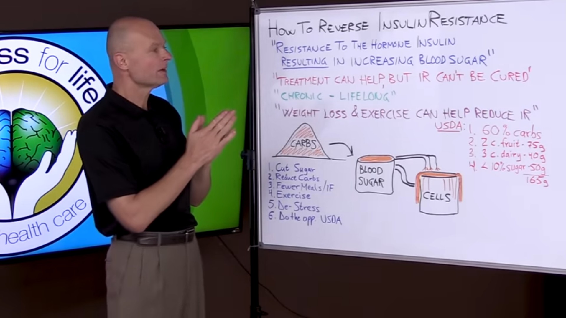 Potrebbe sembrare un po' severo, ma fate l'opposto di quanto raccomandato dalle linee guida dell'USDA, della Mayo Clinic e di tutti gli altri: fate praticamente l'opposto, perché nelle loro linee guida vi dicono di mangiare 165 grammi di zucchero al giorno, ma questo non vi renderà sani e non ridurrà la vostra insulino-resistenza. Non esiste una quantità di esercizio fisico che possa creare una soluzione permanente. E' più o meno quello che hanno provato con The Biggest Loser e la stragrande maggioranza di quelle persone, chiunque di loro non sia riuscito a continuare ad allenarsi sei o sette ore al giorno, ha ripreso tutto il peso perché ha compromesso il proprio metabolismo: non ha ridotto la resistenza all'insulina, ha abbassato il metabolismo basale e ha perso peso solo finché è riuscito a mettere il proprio corpo in uno stato di emergenza, allenandosi tutto il giorno e digiunando. Tutto funziona per un po', ma se non riesci a mantenerlo e non riesci ad aiutare le cellule a diventare meno insulino-resistenti, allora l'effetto è temporaneo.