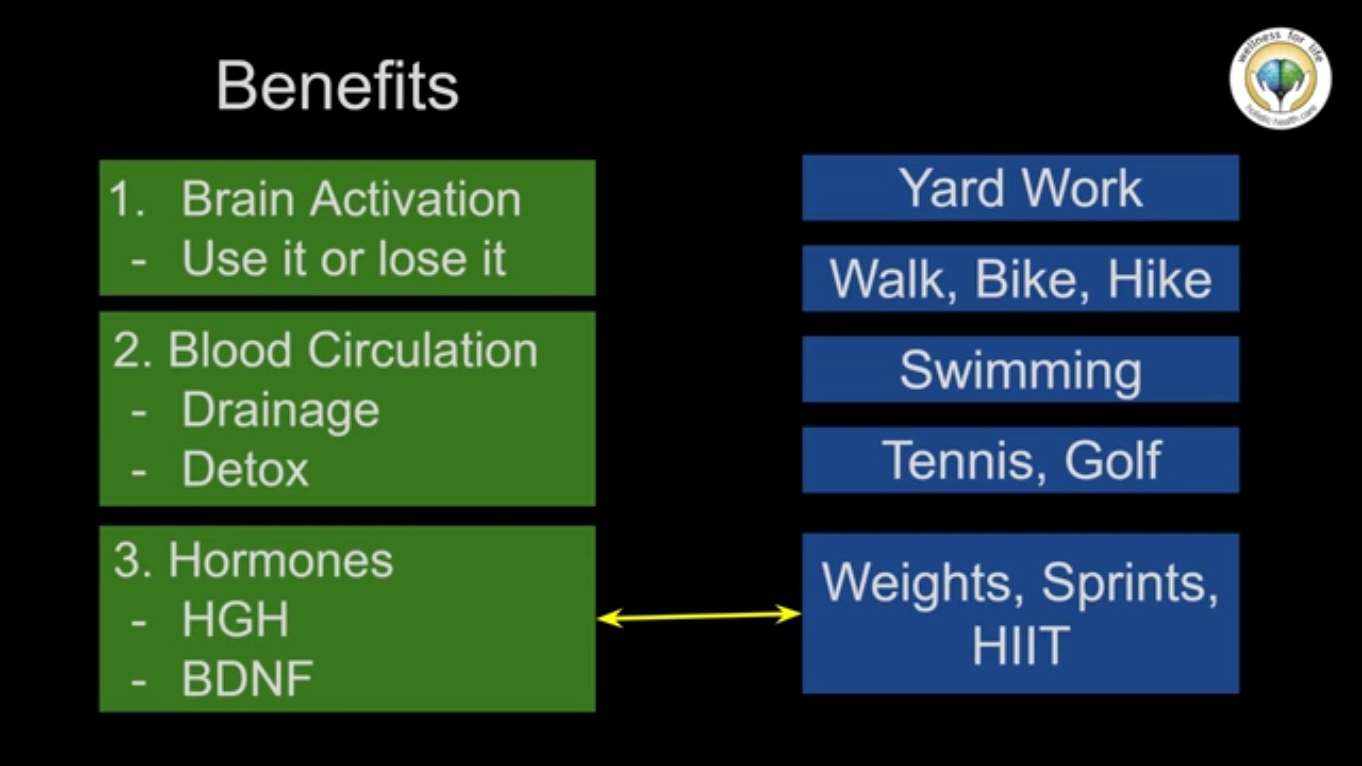 Ma che tipo di esercizio bisogna fare per ottenere un determinato beneficio? Ho realizzato molti video, quindi vi invito a guardarli per saperne di più, ma finora abbiamo parlato dell'attivazione cerebrale, del principio “use it or lose it” (usalo o lo perdi), che è di gran lunga il motivo principale per fare esercizio fisico, ma ci sono altri benefici, uno dei quali è la circolazione sanguigna, perché la circolazione sanguigna favorisce il drenaggio, porta nutrienti ai tessuti e porta via i prodotti di scarto dai tessuti, quindi se si aumenta la circolazione si aumenterete la distribuzione sia dei nutrienti che delle scorie, il che aiuta la disintossicazione. Quindi la circolazione sanguigna è estremamente importante per la disintossicazione e per la corretta eliminazione delle scorie dal corpo.